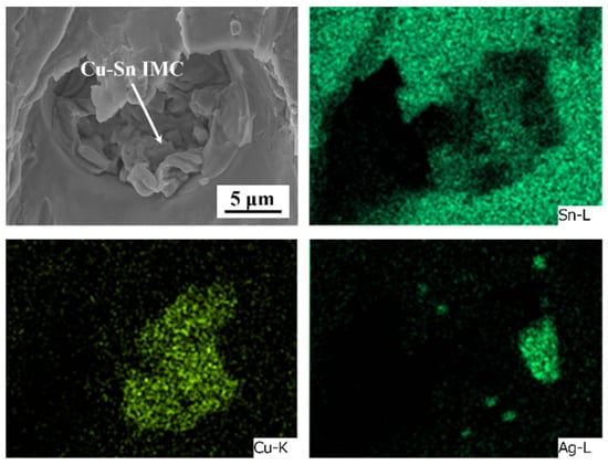Figure 11 shows the fracture surfaces of the monolithic SAC305 and epoxy composite SAC305 solder joints aged for 1000 h. As presented in Figure 11e, the fracture morphology of the monolithic SAC305 solder joint displayed some shear dimples, and several pits were observed at the dimple bottom. The EDS element mapping showed that the Cu content in the pits was high, and the internal particles could be identified as a Cu-Sn IMC based on the EDS analysis results listed in Table 3. Figure 12 shows the magnified image of the marked region in Figure 11e, indicating that some Cu-Sn IMCs were exposed at the dimple bottom. This means that the crack propagated through the brittle interfacial layer. The thickness and morphology of the interfacial layers play a crucial role in the evolution of the fracture behaviors of the as-aged SAC305 solder joints. The interfacial IMCs exhibited rapid coarsening and flattening during aging, leading to pronounced stress concentration near the interface due to their inherent brittleness. Thus, the cracks were prone to nucleate and propagate near the interface under the external forces. It can be seen that, after isothermal aging, the fracture position gradually moved from the solder bulk towards the vicinity of the interface of the solder bulk/IMC layer, and that the fracture mode displayed a ductile/brittle mixed pattern. Wu et al. [46] also reported that, upon reaching a specific duration of aging, the fracture behaviors of a low-silver SnAgCu/Cu joint transformed from occurring within the solder bulk to taking place at the Cu-Sn IMC layer, due to the thermal expansion mismatch.