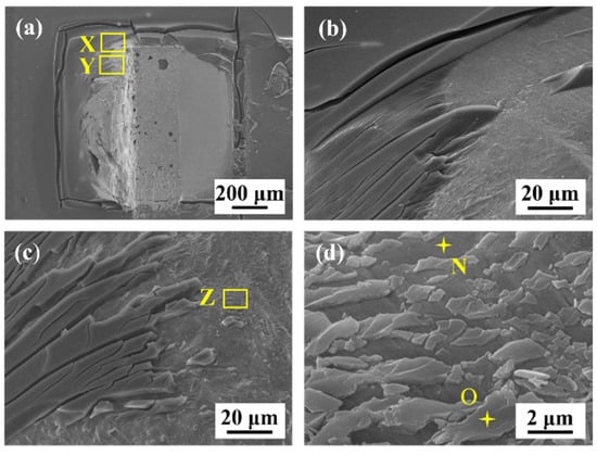 However, as presented in Figure 11b–d, the fracture still presented ductile characteristics for the epoxy composite joints, and the fracture location remained in the solder matrix. The ductility improvement could be ascribed to a lower IMC growth rate, which reduced the stress concentration caused by the excessive growth of brittle IMCs. More details are given in Figure 13 to observe the broken epoxy resin of the SAC305-8ER solder joint after fracture. It can be observed from the magnified image in Figure 13d that some broken epoxy residue (the light gray area, such as Point O) was attached to the joint surface (the dark gray area, such as Point N) after the shear test, which indicated the excellent adhesion between the epoxy layer and the solder surface.