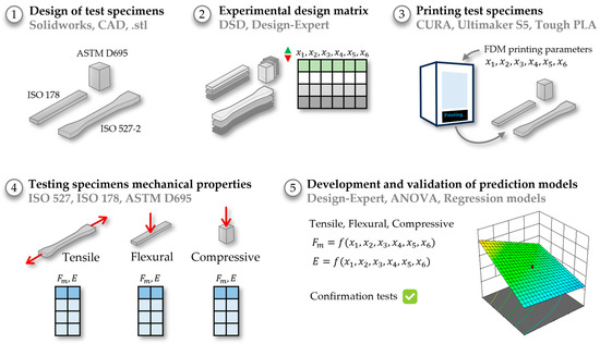 However, traditional DoE methods are resource and time-expensive, especially in experiments with a relatively large number of factors. To overcome the disadvantages of the conventional approaches, an alternative DoE method named definitive screening design (DSD) was introduced [23]. Using DSD, the screening of factors and optimization of responses are performed in one step, i.e., one experiment. This is achieved by the convenient properties of DSD which allow the estimation of main effects, two-factor interactions, and quadratic effects, simultaneously. All main effects are orthogonal to all quadratic and all two-factor interaction effects; however, though correlated, quadratic effects are not completely confounded with two-factor interaction effects. DSD allows variation of continuous factors on three (low, middle, and high) and categorical on two levels (low and high). In a review of the literature, DSD has been conducted in FDM to determine the impact of layer height, deposition angle, infill, extrusion speed, extrusion temperature, air gap, build orientation, road width, number of contours, and bed temperature for PLA and PC-ABS on creep deformation, flexural properties, tribological properties, surface roughness, and dimensional accuracy [24,25,26,27,28,29]. In addition, DSD was used to develop regression prediction models to predict the properties of FDM material and presented with adequate predictability [30,31]. However, DSD has yet to be employed to investigate and predict the printing parameters’ impact on Tough PLA. Definitive screening design was used as the main experimental design for this study due to its advantages of requiring a minimal number of experimental runs, leading to efficient utilization of resources and time, as well as its capability to perform effects screening and optimization of responses in one-step experimental design.