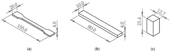 Design of specimens used for testing of (a) tensile properties, designed according to ISO 527-2; (b) flexural properties, designed according to ISO 178; and (c) compressive properties, designed according to ASTM D695 (all dimensions in mm).