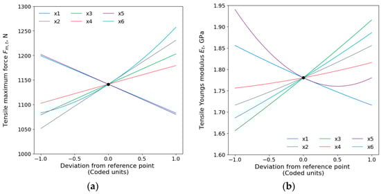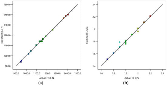 Regression models, with parameter values in coded units, for prediction of the tensile, flexural, and compressive maximum force and Young’s modulus , are developed using the least squares method and are mathematically described by Equations (3)–(8). Only statistically significant terms are included in the models () such that the models’ hierarchy is preserved. This approach provides reduced (optimized) models and sufficient degrees of freedom for reliable estimation of lack of fit and pure errors. It can be noticed that all models include all the main effects, some of the two-factor interaction, and quadratic effects.