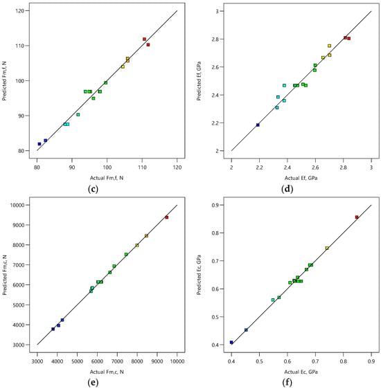 Predicted vs. actual plots for tensile (a) maximum force and (b) Young’s modulus ; flexural (c) maximum force and (d) Young’s modulus ; and compressive (e) maximum force and (f) Young’s modulus . Color code indicates a range of low (blue) to high (red) values of the response.