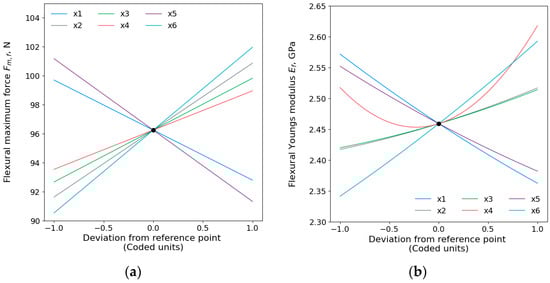 Main effect plots of flexural maximum force and flexural Young’s modulus are shown in Figure 5. The order of printing parameters affects flexural where the printing temperature () has shown the dominant influence, followed by the printing speed (), wall thickness (), infill density (), layer height (), the interaction of layer height and wall thickness (), build plate temperature (), and, lastly, the interaction of wall thickness and infill density (). The Young’s modulus effect order for each parameter has been obtained and presented that the printing temperature was the most influential, and then the layer height, printing speed, square of build plate temperature (), the interaction of build plate temperature and printing speed (), build plate temperature, wall thickness, and infill density.