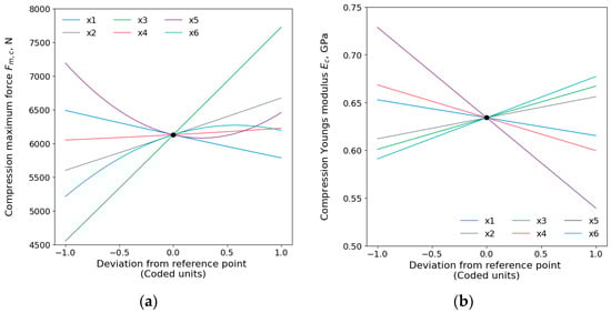 Main effect plots of compressive maximum force and compressive Young’s modulus are depicted in Figure 6. The order of effects on compressive evidently shows that infill density () has the most significant influence, followed by wall thickness (), printing temperature (), printing speed (), layer height (), the square of printing speed (), the square of the printing temperature (), the interaction of the build plate and printing temperatures (), and the least important was the build plate temperature (). The compressive Young’s modulus was affected by the considered printing parameters in the following order: printing speed, printing temperature, build plate temperature, infill density, interaction of infill density and printing speed (), the interaction of layer height and infill density (), wall thickness, and, finally, the layer height.