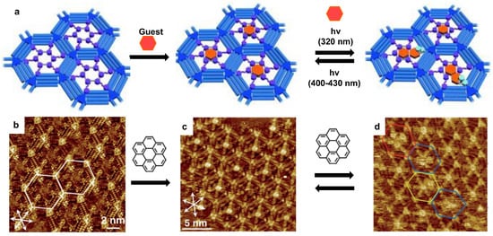 Later, Tahara et al. investigated the photo-induced phase transition of SAMs in a more complex system, involving a photo-induced guest adsorption and desorption process []. The schematic illustration clearly demonstrated the photo-induced guest adsorption and desorption process in DBA pores, see Figure 2a. Firstly, the trans-form azobenzene-functionalized DBA self-assembled into a hexagonal porous structure at the 1-octanoicacid/graphite interface, see Figure 2b. After adding the coronene guest molecules into the system, one of each coronene molecule was immobilized in one pore formed by the trans-azobenzene-functionalized DBA, see Figure 2c. Upon light-irradiation at 320 nm, the trans-to-cis transformation occurred with desorption of one or two azobenzene units from the substrate surface, which left sufficient space for the accommodation of additional coronene guest molecules in the pores, see Figure 2d. Reversely, applying a light-irradiation at 400–430 nm initiated the cis-to-trans transformation, which promoted the re-adsorption of the trans-molecules onto the substrate surface and excluded the extra guest molecules. Yokoyama et al. demonstrated the investigation of photo-activated structural switch behavior of a photochromic terthiophene derivative with STM at the solid–liquid interface []. No ordered structure was observed for the closed-ring phase of a terthiophene derivative, while it underwent a phase transition to two ordered phases (α-ordering and β-ordering) due to the visible-light-induced ring opening of the terthiophene derivative. When UV light was used for the photo-induction, a third ordered phase (γ-ordering) appeared due to the formation of the annulated isomer. It is also possible to control the conductance of molecular electronics via light-irradiation-induced opening and closing of the ring of the thiophene unit of SAM on Au substrate. A reversible conversion between two distinguishable conductance states can be controlled via photoisomerization of the switches by using alternative irradiation with UV (λ = 313 nm) or visible (λ > 420 nm) light to achieve the on-state and off-state, respectively. This transition process was clearly probed by the STM images, showing the distinct height difference between the one-state (0.4–0.6 nm) and off-state of the molecules (0–0.1 nm) []. Recently, photo-induction has been combined with the STM technique to generate a STM junction for building ultrafast photon-induced tunneling microscopy []. Photon-induced tunneling currents were successfully generated and detected by differential conductance (dI/dV) measurement of tetrathiafulvalene (TTF) and tetracyanoquinodimethane (TCNQ) molecules with STM setup upon laser pulse induction. Angstrom scale spatial resolution and sub-femtosecond temporal resolution were simultaneously accomplished, which opened a new avenue to the study of molecular electron dynamic behavior in intricate systems, with no necessity of reconstruction techniques.