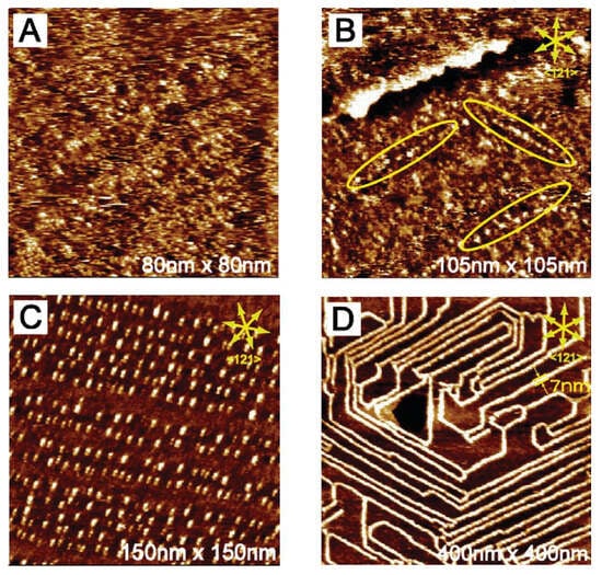 An electric field is an efficient way to control the surface self-assembly process of molecules. The surface structural transition influenced by the electric field is indicative of the modulation of the interaction between the substrate and the molecule, as well as potential changes in intermolecular interactions, which normally lead to the order–disorder transition, surface coverage manipulation and polymorph switch. Lee et al. reported that a reversible transition between low-density porous and high-density nonporous SAM networks of 1,3,5-tris(4-carboxyphenyl)-benzene (BTB) molecules was successfully achieved by applying bias voltage with opposite signs through STM, due to the protonation or deprotonation process of the BTB molecules []. Based on this porous–nonporous structure transition, a controlled capturing and releasing of guest molecules was accomplished at the solution–solid interface. Additionally, the voltage induction was also feasible to initiate the phase transformation between the SAMs and covalent organic frameworks (COFs). Cai et al. formed a SAM of 1,3,5-tris(4-biphenylboronic acid)benzene (TBPBA) on HOPG with a closely packed structure under ambient conditions with a positive bias voltage applied to the substrates and the molecules []. When the substrate and the molecules were applied with negative bias voltage, the noncovalently bonded TBPBA molecules were arranged into a loosely packed porous structure with the co-adsorption of 1-octanoic acid solvent molecules as the guests inside the cores and more interestingly the boronic acid groups of each TBPBA molecule formed covalent bonds with the three adjacent molecules. The electric-field-induced phase transition between the SAM and COF was totally reversable independent of the polarity of the applied bias voltage. However, this method was just able to control the local structure of molecules around the STM tip. Luckily, applying an electrochemical STM (EC-STM) system, which allows to independently control the tip and substrate voltage, can globally control the phase transition process over the entire substrate. Wen et al. reported a sequential control of the polymorph change of SAM of nitrobenzene and picric acid on Au (111) substrate in 0.1 M HClO4, which was recorded by an EC-STM []. At surface potential of 550 mV, nitrobenzene molecules formed a well-ordered SAM in a (× ) organization. The molecules started to nucleate into organic islands at 300 mV and further transformed into 1D molecular wires at 220 mV. By holding such substrate potential for 4 h, the density and continuity of the molecular wires expanded. This phase transition was caused by the irreversible reduction of the nitro groups into hydroxyamino and amine groups depending on the applied substrate potential. In contrast, picric acid formed a disordered phase at 500 mV (Figure 3A), and bright clusters started to appear at 360 mV (Figure 3B). More clusters grew by shifting the substrate potential to 250 mV and they were aligned following the preferred directions, see Figure 3C. Finally, at 200 mV, the aligned clusters were connected into molecular wires along the reconstruction lines of Au (111), see Figure 3D.