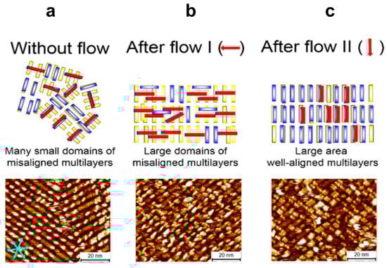 The scheme of two-step flow induced fabrication of long-range ordered HDI thin films on HOPG. (a) Without flow; (b) after flow I; (c) after flow II. Cyan arrows indicate graphite symmetry axes. The rectangles with different colors represent molecules adsorbed in different layers. Red arrows indicate flow direction. Reproduced with permission from ref. []. Copyright 2014, American Chemical Society.