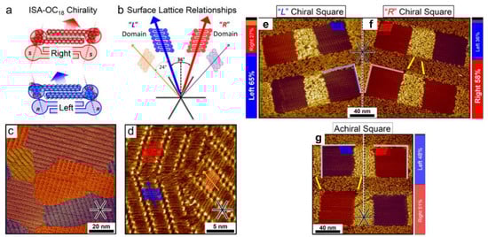 The scheme showing (a) ISA-OC18 S and R chirality and (b) L and R domain with respect to the HOPG surface lattice direction [210]; STM images of (c) large-area and (d) small-area SAM of ISA-OC18 on HOPG without confinement; STM images of (e) SAM of ISA-OC18 in L chiral square, (f) R chiral square and (g) achiral square. The yellow arrows point at the occasional imperfections at nanocorral borders. Reproduced with permission from ref. []. Copyright 2018, American Chemical Society.
