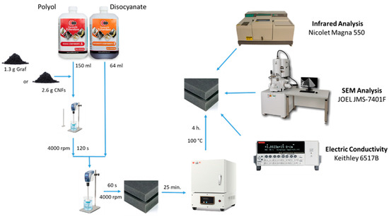 For the manufacture of foamed polymers composed of 0.5% wt./wt. of graphite and 1% wt./wt. of CNFs (concentrations selected from the maximum loading percentage of the conductive materials in the polyurethane matrix), 1.3 g of graphite and 2.6 g of carbon nanofibers were dispersed in 150 mL of polyol by mechanical stirring until homogeneous. Subsequently, 64 mL of disocyanate was added to each sample and mixed for 60 s with a double-blade homogenizer at 4000 rpm. The already foamed system was allowed to settle for 25 min. Finally, the foam was cured in an oven at 100 °C for 4 h (Figure 1). Table 1 shows the composition used to prepare each composite.