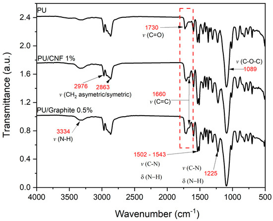 FTIR spectrograms of PU, PU/Graphite 0.5% wt./wt. and PU/CNF 1% wt./wt.