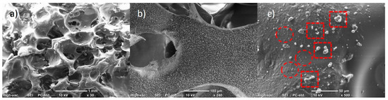Figure 6 shows the composites made with 1% wt./wt. of CNFs at different magnifications. It is observed (Figure 6a) that the use of nanoparticles shortens the domains of the polymer matrix, preventing the formation of a cellular structure in the system, decreasing the volume of the material obtained and increasing its density and resistance to the flow of a medium through the material. In addition, it is observed that the polymeric domains have a higher roughness in relation to the pure PU matrix. Such roughness is suggested to be formed by the dispersion of the agglomerates and nanoparticles of the CNFs on the surface of the polymeric matrix during the foaming reaction (see Figure 6b) [28]. In Figure 6c, it can be observed that the forces during foaming that occur in the composite formation reaction generate the homogeneous dispersion of the nanoparticles; however, it causes the rupture of the CNF agglomerates to different degrees, causing the CNFs to be obtained individually (enclosed in red circles), as well as agglomerates of various sizes (framed in red dotted boxes). Quiang et al. [29] found that adding carbon particles produces roughness on the surface of the polymer matrix, which results in a greater surface area that could be used in absorption applications. Similar results were obtained by Shi et al. [28], mentioning that carbon-based particles could be firmly anchored to the surface of a PU matrix, making it rougher. In addition, they mention that a smaller particle has a higher velocity (higher kinetic energy) in the dispersion promoted by the foaming process, thus leading to a greater adhesion of the particles to the PU foam. Additionally, various reports have mentioned that PU foam microstructures in which carbon particles are added trigger heterogeneous cell nucleation and decrease cell size [30,31], suggesting that the observed structural differences are mainly due to the dispersion obtained depending on the carbon structure used.