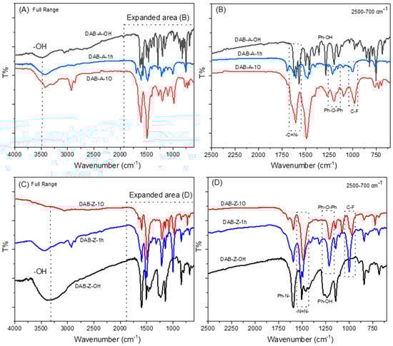 FTIR in the full and expanded ranges: (A,B) DAB-A-OH and the corresponding polymers; (C,D) DAB-Z-OH and the corresponding polymers.