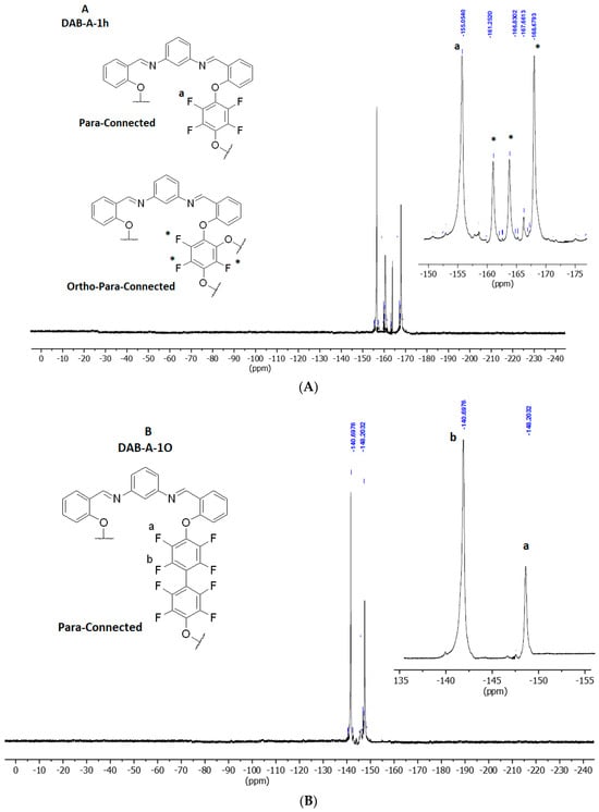 The azomethine-based polymers (DAB-A-1h and DAB-A-1O) were synthesized through the polymerization of HFB or DFB with DAB-A-OH, respectively (Scheme 2). According to the NAS, the anticipated structure of DAB-A-1h should exhibit one type of 19F located at the −155 ppm position, which corresponds to the fluorine of the C-F bonds labeled (a) in Figure 2A. However, the 19F NMR spectrum of DAB-A-1h exhibited three additional peaks at positions −157.8, −160.8, and −167 ppm, which can be attributed to the formation of side products resulting from the polymerization on the ortho-sides labeled (*). In contrast, the 19F NMR spectrum of DAB-A-1O confirmed the successful and controlled para-substituted open chain through the presence of two distinctive peaks at −141 and −148 ppm, as shown in Figure 2B. These peaks were assigned to the two different types of fluorine in the C-F bonds on the biphenyl linker, labeled (a) and (b) in Figure 2B.