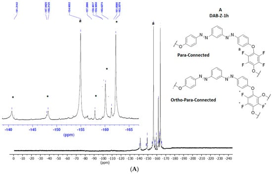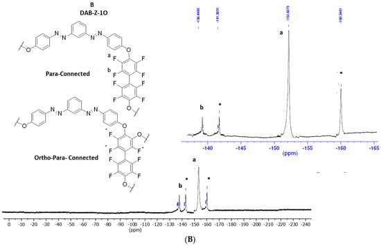 Fluorinated polymers with diazo-based linkers (DAB-Z-1h and DAB-Z-1O) were prepared by coupling DAB-Z-OH with HFB and DFB, respectively. The 19F NMR spectra of both polymers indicated the formation of cross-linked structures in addition to the expected open chains. The linker DAB-Z-OH contained hydroxyl groups adjacent to the azo group, unlike DAB-A-OH (Scheme 1B). The presence of hydroxyl groups adjacent to the azo group in DAB-Z-OH increased the accessibility of the fluorine atoms for the NAS during polymerization. The free rotation of the fluorinated linkers allowed for random substitution of the phenoxide on the C-F sites, which led to the elimination of steric factors and facilitated the NAS. As a result, cross-linking occurred, forming both expected open chains and cross-linked structures in DAB-Z-1h and DAB-Z-1O, as confirmed by their 19F NMR spectra. The 19F NMR spectrum of DAB-Z-1h indicated a peak at −154.95 ppm labeled (a) in Figure 3A, which was assigned to the fluorine of the C-F bonds of the para-connected polymer. However, the other peaks at −140.70, −147.97, −148.21, −157.93, −160.62, −161.35, and −162.25 ppm were attributed to C-F bonds that were formed due to the random polymerization, as shown in Figure 3A. Similarly, in the 19F NMR spectrum of DAB-Z-1O, two peaks at −138.88 and −153.97 ppm were observed, labeled (a) and (b) in Figure 3B, corresponding to the C-F bonds of para-connected chains. Other peaks around −138.64, −141.3, and −160.34 ppm were related to C-F bonds after random polymerization. The presence of asymmetric structures due to the flexible rotation of the chains was indicated by the observed duplication of peaks.