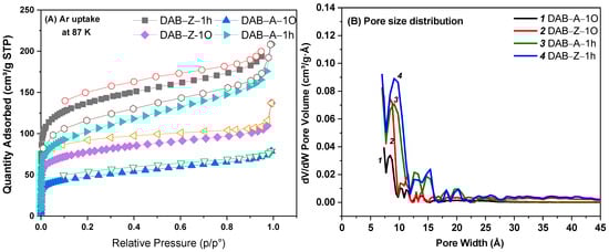 (A) Argon uptake isotherms at 87 K (closed symbols: adsorption, empty symbols: desorption); (B) pore size distribution.