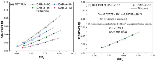 (A) BET multi-point fitting; and (B) determination of the BET of DAB-Z-1h. (X is the weight of gas adsorbed at relative pressure (P/P0)).