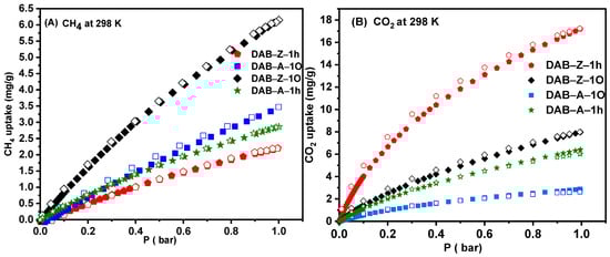 (A) CH4 gas uptake by the polymers at 298 K; (B) CO2 gas uptake by the polymers at 298 K.