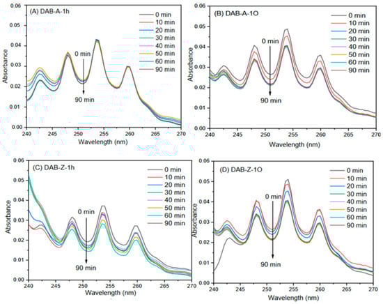 The UV–visible spectra of benzene adsorption by polymers over a period of time.