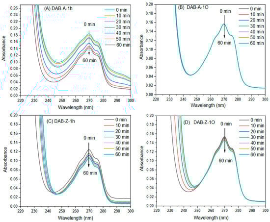 Figure 9A shows the UV–Vis absorption of the benzene-water solution. DAB-A-1h displayed a consistent trend for benzene adsorption throughout the measurement time. This behavior can be attributed to its hydrophilic nature due to free C-F and nitrogen. Additionally, the ortho-connected structure of DAB-A-1h facilitated the formation of an agglomerated and collapsed structure, which led to a reduction in surface area and a subsequent limitation in the ability of benzene to be adsorbed on the surface or within the pores. DAB-A-1O exhibited a more distinct trend for benzene separation from water in the initial measurement after 10 min, as shown in Figure 9B. This behavior suggests that the adsorption of benzene on the octafluorobiphenyl linker occurred as a one-layer adsorption with time. The para-open extended chain and the ortho-para-branched framework of the diazo-based polymers (DAB-Z-1h and DAB-Z-1O) were confirmed to form cross-linked structures through the 19F NMR spectra. Moreover, the azo-groups in these polymers were found to be para-related to the ether C-O-C bond (as depicted in Scheme 3), which facilitated the rate of nucleophilic aromatic substitution (NAS) and promoted the flexible rotation of the chains. This, in turn, increased the rate of interaction with the solvent, as demonstrated in Figure 9C,D. The initial response of these polymers towards benzene adsorption during the first 30 min can be attributed to the presence of accessible C-F sites that possess a diminished dipole moment Figure S15.