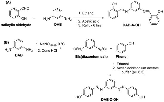 Synthetic routes of linkers (A) DAB-A-OH and (B) DAB-Z-OH (DAB: 1,3-diaminobenzene).