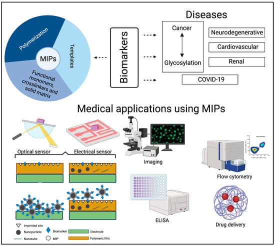 The aim of this review is to discuss the latest advancements in MIP systems and their practical use in detecting a wide range of diseases (Figure 1). We begin with an overview of the fundamental principles behind the MIP imprinting technique. Subsequently, we delve into the diverse applications of MIP systems within the medical domain, with a focus on targeting and biomarker detection. Finally, we engage in an extensive discussion concerning the integration of MIP systems for the diagnosis of various diseases, including cancer (particularly focusing on glycosylation, drug delivery, and biosensors), neurodegenerative disorders, cardiovascular diseases, COVID-19, and renal diseases (Figure 1). An important field within medicine is the use of MIPs for the detection of pharmaceuticals (e.g., therapeutic drug monitoring), but this will not be covered in this paper since comprehensive information can be found elsewhere [6,7,8].