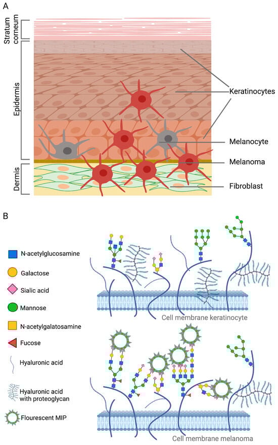 (A) The layers of the skin comprise the stratum corneum, with cornified flat keratinocytes (upper); the epidermis, with different stages of keratinocytes, melanocytes, and immune cells (middle); and the dermis, with mainly fibroblasts (lower). (B) The expression of monosaccharides and glycosaminoglycans is illustrated on the cell membranes of keratinocytes (upper) and melanoma cells (lower). Since the binding of SA-MIPs to keratinocytes was absent in the unpublished study, the cell membrane of this cell type is proposed to express more glycosaminoglycans than monosaccharides. On the other hand, melanoma cells are proposed to express high amounts of monosaccharides since these cells showed good SA-MIP binding.