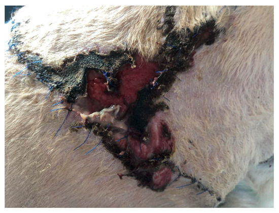 The last case (D4), a five-year-old female of mixed breed weighing 14 kg, was brought to the clinic due to the dehiscence of a surgically treated laceration wound. This wound was situated in the middle of the right side of the abdominal wall, extending into the area of the right groin (Figure 4). To address this issue, the wound site was thoroughly cleaned of surface contaminants, and PCL/GelitaSpon/PVP-I, in conjunction with ointments containing ATB, was applied to the wound site.