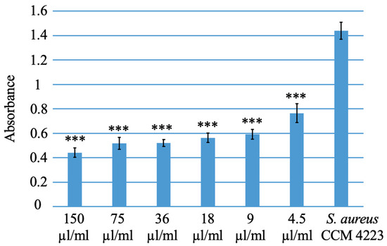 The antibacterial activity of PVP-I against Escherichia coli CCM 3954 and Staphylococcus aureus CCM 4223 was tested spectrophotometrically using a serial dilution method in microtiter plates, measuring absorbance with a Biotek Synergy 2 instrument. All used iodine concentrations exhibited significant antibacterial effects against Escherichia coli CCM 3954 compared to the control (Figure 8) and also against Staphylococcus aureus CCM 4223 (Figure 9).