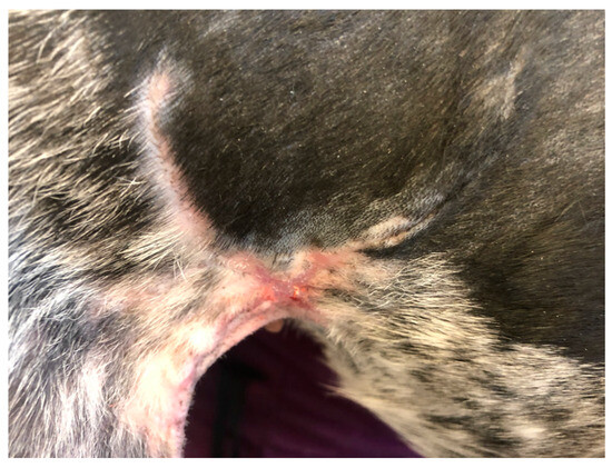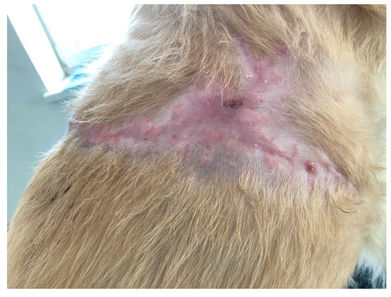 In the case of D1, with surgical wound dehiscence resulting from a bite injury, we observed the formation of healthy granulation tissue and the development of an epithelialization lining at the wound’s edges on the third day of treatment (Figure 10). Treatment was sustained until the skin defect completely closed, which occurred on the 38th day from the initiation of treatment (Figure 11).