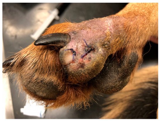 The third dog, D3, which had a stab wound on the plantar surface of the fifth toe of the left pelvic limb, experienced a reduction in swelling within the initial 48 h. Significant formation of new granulation tissue followed after debridement of the affected areas. The wound successfully closed 11 days after the initiation of treatment (Figure 14). Reepithelialization of the wound surface was observed on the 14th day following the initiation of treatment (Figure 15).
