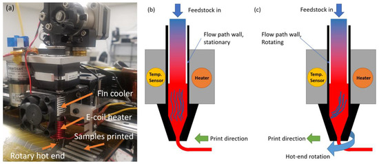 (a) Spinning nozzle experimental apparatus with contactless heater (E. coil) and printed sample on build plate. (b) Schematic diagram of nozzle region when it is stationary. (c) Schematic diagram of nozzle region when the nozzle is rotating. For (b,c), the blue curved lines inside the nozzle represent the predicted behavior of the polymer chains (plotted thousands of times larger to clearly show) due to the friction between the material and nozzle wall.