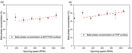 To investigate the effect of this tortional strain rate on the β-phase concentration in PVDF, we prepared seven sample groups with different nozzle spin rates ranging from 0 to 1062 rpm. All samples were printed with a 250 °C nozzle temperature and a 100 °C bed temperature at 10 mm/s, as recommended by the manufacturer (Nile Polymers). The β-phase concentration data were obtained using Fourier Transform Infrared Spectroscopy (FTIR). An increase in the β-phase concentration was observed as the nozzle spin rate increased (Figure 2). Specifically, at 1062 rpm, the concentration increased from 33% to 42% (Figure 2b). The authors attribute this increase to the continuous torsional shear strain generated by the friction between the material and the nozzle wall during 3D printing at two locations in the extrusion path: (1) within the heated chamber, where the part of feedstock transitioned from rigid solid state to polymer melt, and (2) at the nozzle exit, where the extruded material is sheared between the rotating nozzle and the stationary print surface. The underlying physics behind this increase is that stretching of the polymer melt leads to the alignment of the polymer chains, resulting in a higher β-phase concentration [18]. In the spinning nozzle process, the stretch on the polymer melt increases with the nozzle spin rate and, therefore, increases the chain alignment and the β-phase concentration.