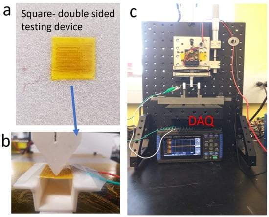To further evaluate the piezoelectric properties of the material printed using the spinning nozzle technique, six devices were prepared, as illustrated in Figure 3a. The devices depicted in Figure 3a consist of two layers of 3D printed PVDF with two layers of ultrasonically embedded copper wires as electrodes. The tooling setup for the test is illustrated in Figure 3b, while the testing apparatus, including the cyclic movement control and data acquisition, is shown in Figure 3c. All four spinning samples were printed at a spinning rate of 500 rpm. The voltage difference between the two layers of copper electrodes was monitored as the cyclic bending was introduced to the devices in a three-point bending configuration.
