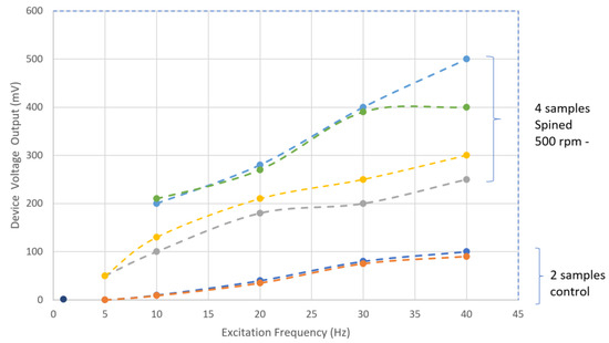Piezoelectric property test: voltage output at a set of frequency for control and spinning samples.