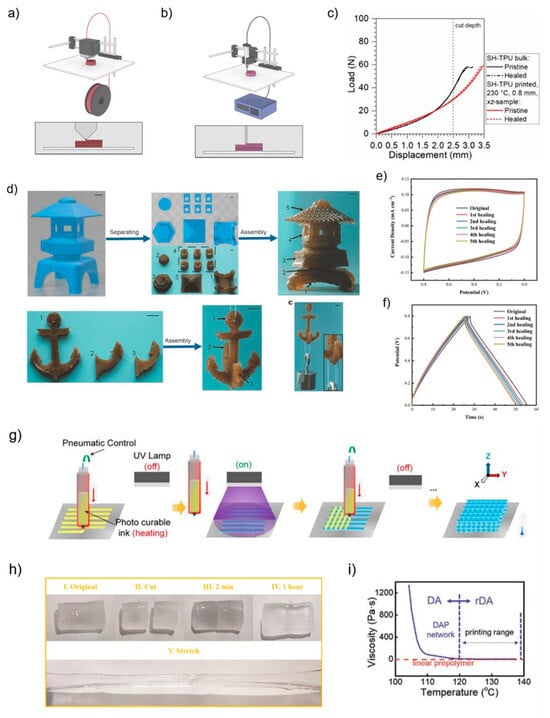 (a,b) Schematic diagram of fused deposition modelling (FDM) and direct-ink writing (DIW) []. (c) Compression-cut mechanical characterization of healed FDM-printed and bulk SH-TPU polymers []. (d) Example of free assembly of 3D-printed parts into complex objects. The numbers in the photographs represent the order of assembly []. (e) CV curves of the MSC at different damage/self-healing cycles. (f) GCD curves of the MSC at different damage/self-healing cycles []. (g) DIW-based 3D printer equipped with heating elements prints each filament layer followed by shining UV light to cure the resin []. (h) Digital photographs demonstrating the self-healing process of the hydrogel designed by Wang et al.: I original state; II cut into two pieces; III self-healing in 2 min; IV self-healing in 1 h; V stretching after healing []. (i) Viscosity of the DAPs and the linear prepolymer as a function of temperature [].