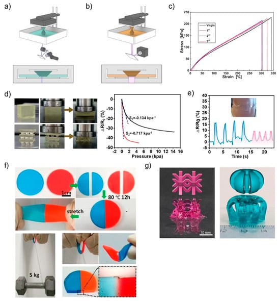 (a,b) Schematic diagram laser stereolithography (SLA) and digital light processing (DLP) []. (c) Liu et al. designed SLA-printed silicone elastomers with 97% healing efficiency []. (d) Comparison of the pressure sensitivity of the planar sensors (S1) and micro-structured (S2). Pressure sensitivity (S) is expressed as the relative resistance change ratio over pressure (ΔR/R0)/P []. (e) The micro-structured pressure sensor senses the subtle muscle movements of the throat during the swallowing of water (the first four cycles) and saliva (the last four cycles) []. (f) Image of the polyurethane elastomer designed by Li et al. cut into two pieces, connected, healed for 12 h at 80 °C and, finally, subjected to first stretching manually to a large deformation and then to a 5 kg weight lifting test; optical microscope image of the healing interface of the healed elastomer []. (g) Complex structures with flat surfaces and sharp edges printed by DLP. Body-centered cubic lattice-like structure printed with methyl red sodium salt dye (left); axisymmetric structure with central pillar printed with brilliant green dye (right).