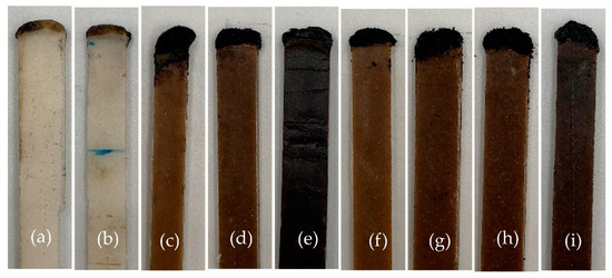 Digital photographs of specimens after LOI test; PBS (a), 30APP/PBS (b), 30WHF/PBS (c), 9WHF/36APP/PBS (d), 11.3WHF/33.7APP/PBS (e), 15WHF/30APP/PBS (f), 13WHF/27APP/PBS (g), 12WHF/23APP/PBS (h), and 10WHF/20APP/PBS (i).