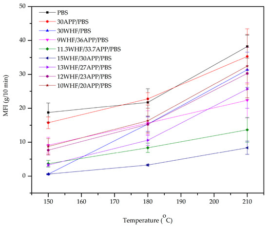 The melt flow index (MFI) test is used to determine the flowability of a thermoplastic polymer during its molten state. The MFI value can be used to indirectly assess the effect of WHF and APP on anti-dripping properties, which enable the material to retain its shape during a fire. To prevent the decomposition of WHF and APP during testing, MFI measurements were performed at temperatures ranging from 150 to 210 °C. The relationships between the MFI values of PBS and PBS composites and temperature are shown in Figure 2.