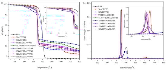 All WHF/APP/PBS composites, with the exception of the 9WHF/36APP/PBS composite, had a one-step decomposition, as shown in Figure 3b. The T5%, T50%, and Tmax values of all WHF/APP/PBS composites were lower than neat PBS, while their W800 values were higher. The increase in char residue at elevated temperatures was a positive signal that reflected the enhanced flame retardancy of the PBS composites [44].