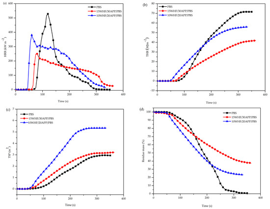 TTI refers to the point at which the concentration of combustible gases released during the material’s decomposition reaches a level that supports ignition. As illustrated in Figure 4 and reported in Table 4, the TTI of neat PBS was 75 s. Both 15WHF/30APP/PBS and 10WHF/20APP/PBS composites showed a reduction in TTI to 65 and 45 s, respectively. The relatively shortened TTI values of the WHF/APP/PBS composites were attributed to the early decomposition of WHF and APP, as evidenced by the TGA results.