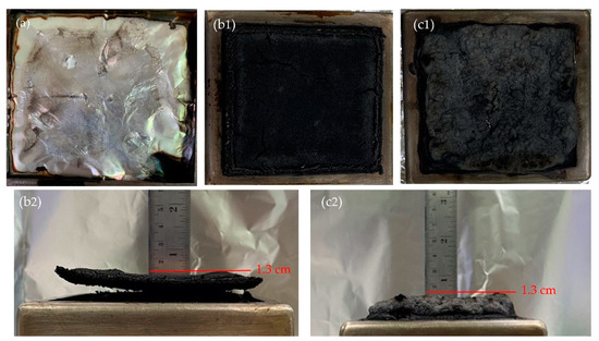 Digital images of residues of neat PBS and WHF/APP/PBS composites after the cone calorimetry test, PBS (a), 15WHF/30APP/PBS (b1,b2), and 10WHF/20APP/PBS (c1,c2).