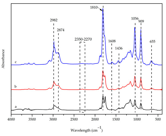 The FTIR spectrum of the gaseous products generated at the Tmax of neat PBS exhi- bited absorption peaks at 2982 and 2874 cm−1, which were attributed to C-H stretching of the -CH2 and -CH3 groups, respectively. The peak at around 1436 cm−1 was related to -CH3 bending, with bands at 1810 cm−1 (C=O stretching) and 1056 cm−1 (C-O-C stretching) related to the presence of succinic anhydride and aliphatic ether. The peak at 909 cm−1 was due to the absorption of vinyl C-H bending of gaseous alkene [22,51]. The bands appearing at 2350–2270 cm−1 (asymmetric stretching of O=C=O) and 655 cm−1 (bending of O=C=O) were related to the formation of carbon dioxide [52]. The identified functional groups and earlier studies suggested that the primary gaseous products from PBS decomposition were alkene, succinic acid, butanediol, succinic anhydride, aliphatic ether, and carbon dioxide.