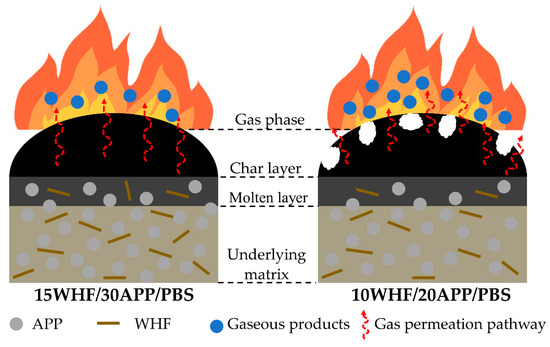 Proposed intumescent flame-retardant mechanisms for 15WHF/30APP/PBS and 10WHF/20APP/PBS composites.