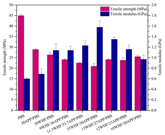 Tensile properties of PBS and its composites are shown in Figure 11. It is clear that the addition of WHF and/or APP has a considerable impact on the tensile properties of PBS. The tensile strength of the APP/PBS, WHF/PBS, and WHF/APP/PBS composites was obviously lower than that of neat PBS, but their tensile modulus was much higher. The 10WHF/20APP/PBS composite had the highest tensile strength among the PBS composites, with a value of 25.52 MPa, which was 43% lower than that of neat PBS. The deterioration of the tensile strength of PBS could be attributed to poor compatibility between the hydrophilic WHF-APP fillers and the hydrophobic PBS matrix. A portion of the additives partially agglomerated in the PBS matrix, and the stress concentration formed around the agglomerated particles, lowering the mechanical performance of the PBS [5]. Nonetheless, the tensile modulus of the 15WHF/30APP/PBS composite reached 1.58 GPa, an increase of 163% compared to that of neat PBS.
