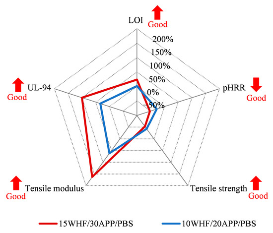 The influence of WHF and APP on the overall performance of PBS is depicted graphi-cally in Figure 12. Incorporating WHF and APP improved the flame-retardant characteristics of PBS, as seen by the simultaneous rise of LOI and UL-94 and a decrease in pHRR. In comparison, the 15WHF/30APP/PBS composite exhibited better flame-retardant pro-perties than the 10WHF/20APP/PBS composite. In terms of tensile properties, both the 15WHF/30APP/PBS and 10WHF/20APP/PBS composites exhibited a noticeable decrease in tensile strength and a significant increase in tensile modulus when compared to neat PBS. Consequently, the combined utilization of WHF and APP as intumescent flame retardants presented a potential avenue for developing bio-based flame-retardant polymer composites suitable for engineering applications. Nonetheless, further improvement is necessary to enhance the mechanical properties in future endeavors.