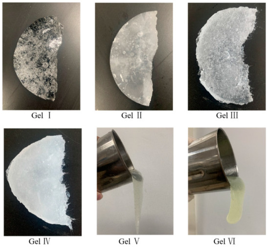 Figure 8. Gel I has a relatively clear and bright surface, while gel II and gel IV, which have dibutyl phthalate added, exhibit a milky white color. Gel III and Gel IV, which have flexible fibers added, show needle-like structures at the fracture site. Gel V and Gel VI have high fluidity and are difficult to form into blocks. The picture shows their appearance when poured out of a cup, suspended in the air.