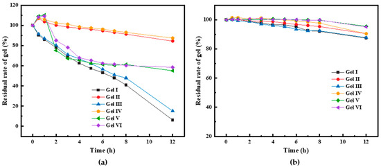 Figure 10a, gel V and gel VI have a certain degree of swelling ability. Within the first 5 h, their volume decreases by almost 40%. Gel V and gel VI absorb a lot of water, which results in high fluidity and low strength. The visual code indicates their strength as C, while the PMG codes for different components are E or above. In some cases, due to gel dissolution, the fiber content increases and the PMG strength becomes very high. Comparing PMG with different compositions, it can be observed that the gel with the addition of dibutyl phthalate exhibits much better anti-dilution performance compared to the gel without dibutyl phthalate. Additionally, when comparing gel I with gel III or gel II with gel IV, it can be noted that the gel with added fibers has a significantly lower loss rate compared to the gel without fibers. During the experimental process, due to prolonged immersion in the fluid, the surface of the gel becomes softer, more prone to dissolution, or susceptible to being washed away by the fluid. If fibers are added to the gel, when the fibers gradually become exposed on the gel surface, the contact area between the fluid and the gel decreases, which helps to slow down the reduction in gel volume. PMG can come into contact with aliphatic hydrocarbon components when it enters the formation. We submerged six types of gels in gasoline using identical experimental procedures. After 12 h of immersion in gasoline, the volume loss of all gels was less than 5%. Detailed results can be seen in