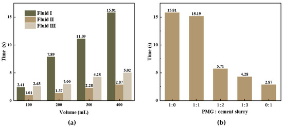 Figure 13b presents tests conducted on a mixture of 400 mL PMG and cement slurry with different ratios. The combination of PMG and cement slurry in a 1:1 ratio took only 5.29 times longer than the time taken for experiments conducted solely with cement slurry. When comparing experiments with ratios of 1:0 and 1:1, the timings are very similar. During the experiment, PMG is not completely discharged, but, rather, after the gel layer breaks, it forms a pathway through which gel fragments and cement slurry can pass. The final timing recorded for gas discharge marks the end of the measurement. In practical applications, consideration should be given to the compatibility of PMG with other fluids to achieve the optimal mixture and effective sealing.