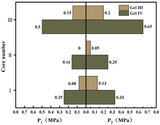Figure 16. During the experiment, the confining pressure was initially adjusted using a hand pump to prevent fluid from passing through the side of the core sample. Then, the pressure of the pressurization device was increased, and the occurrence of gel flow at the outlet end of the core sample was observed. If the water flow could still be blocked after 30 min, the pressure difference was further increased until the sealing could not be maintained.
