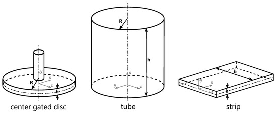 The exploration of unidirectional models has an extensive scientific legacy tracing back to the seminal works of Kamal and Kenig [7,8], Wu et al. [9], Nunn and Fenner [10], Stevenson [11], and William and Lord [12,13]. Similar investigations of thin, rectangular cavities were conducted by Harry and Parrott [14], and Thienel and Menges [15]. These models are characterized by their 1D nature and can be described using different mathematical approximations. These mathematical approximations can be categorized into the geometric shapes of a center gated disc, tube, and strip, as shown in Figure 1.